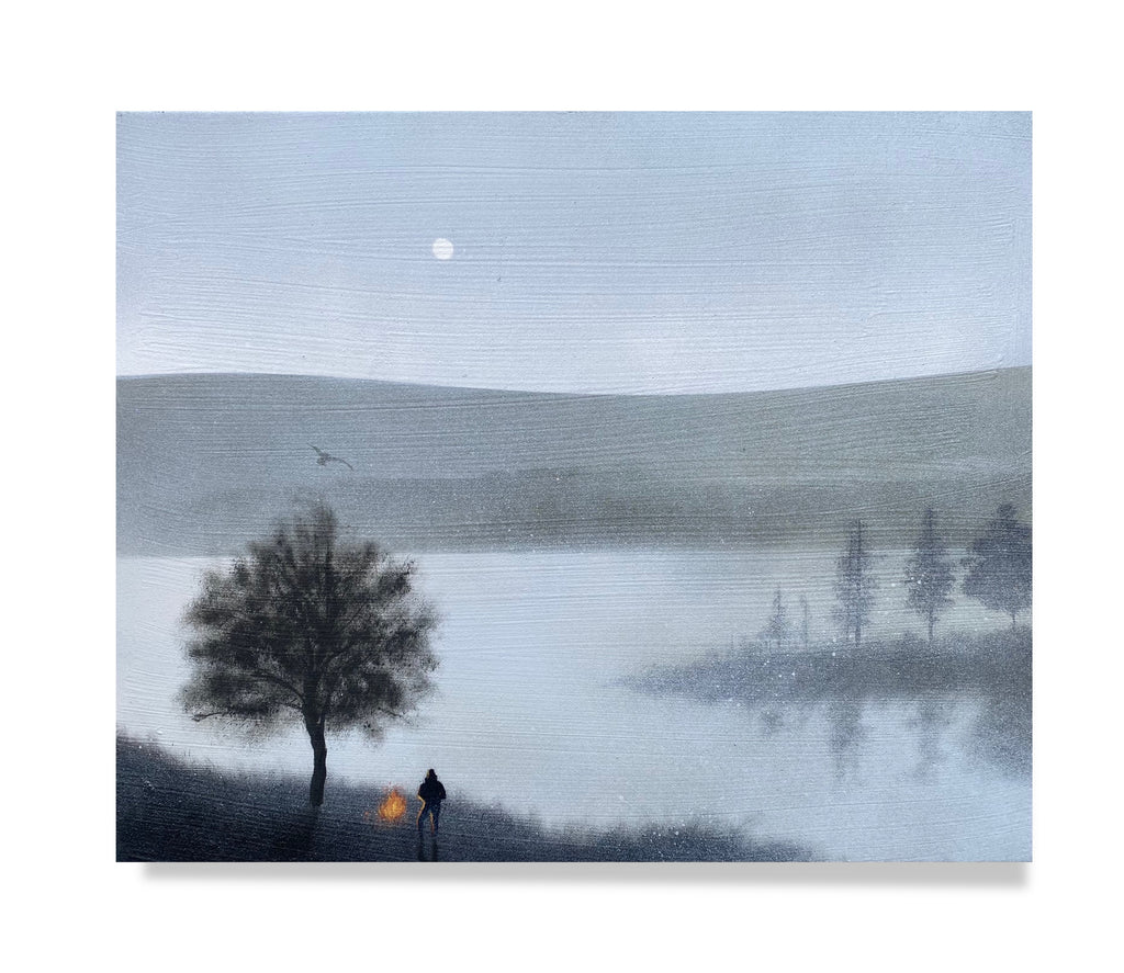 A tranquil depiction of man, water, fire