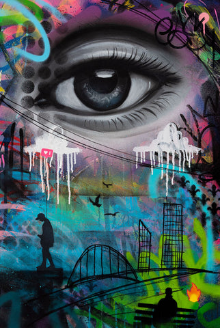 A street art style artwork that depicts modern day lives